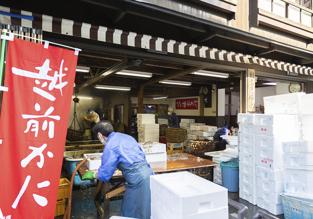 また店頭では、魚市場での競り直後の新鮮な魚介類、1〜3月はゆがきたての越前かに、せいこかにを卸売、小売しています。自家製干物の加工もしています。